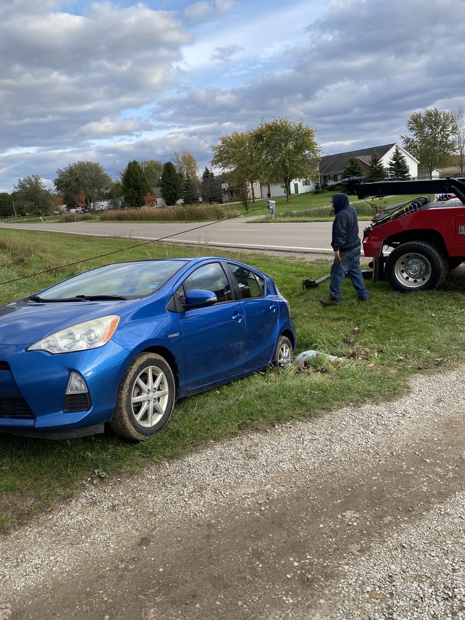 By mid-morning, several neighbors had stopped by or called to offer to help get the blue Prius out of the ditch. Kaitlyn's parents wanted to wait for a tow truck, though, so the car stayed put. In the early afternoon, Kaitlyn's stepmom and grandpa came by to see if they could tow it out. After finding a place to attach the tow strap and spinning ruts into the driveway with their truck, the little blue car stayed where it was.